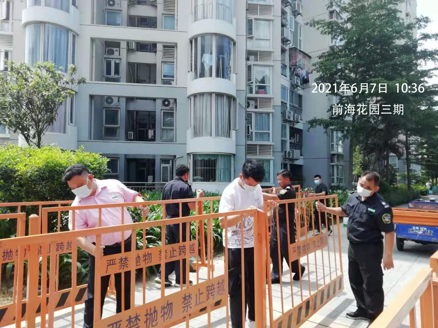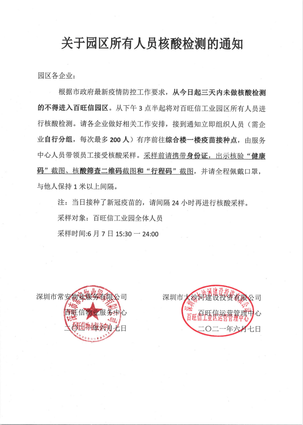 一、緊急協調,布置圍擋。我司前海花園、崇文花園、百旺信高科技工業園、荔苑小區等多個服務中心接獲社區工作站通知的第一時間,各項目主任首當其沖、返回崗位,配合區防疫部門在小區/園區建立圍擋并開展新冠核酸檢測工作,并組織協調休假人員加入應急布置工作之中。